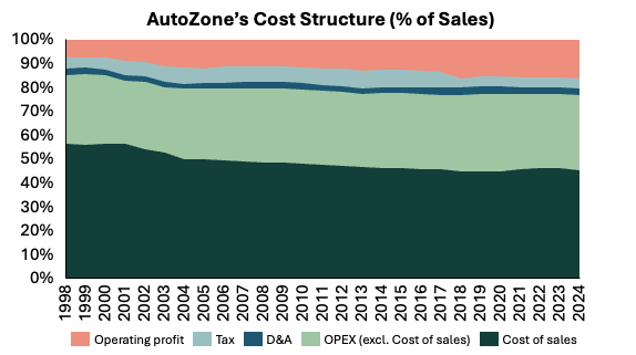 Margin expansion and capital efficiency improvements have driven significant increases in return on invested capital—the yardstick for operational profitability and value creation. AutoZone’s return on invested capital has increased from 13% in 1999 to 45% in 2024, an impressive 32 percentage-point improvement. Essentially, each dollar invested in its operations returns 45 cents annually, after tax. Truly impressive.