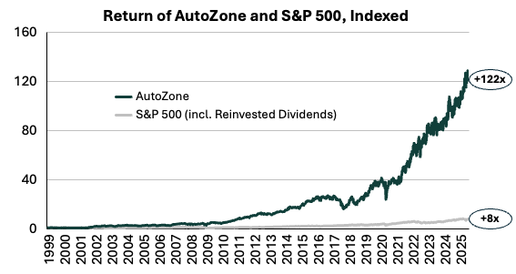 At first glance, selling auto parts might not seem like an exciting business; and in many ways, companies like AutoZone can be characterized as boring. Yet despite its mundane facade, AutoZone has been one of the most remarkable success stories in retail. Since its year-end results in 1998, its share price has increased from $30 to $3,683—a 122-fold increase, compounding at an annual rate of 20% and outperforming the S&P 500 by a wide margin.