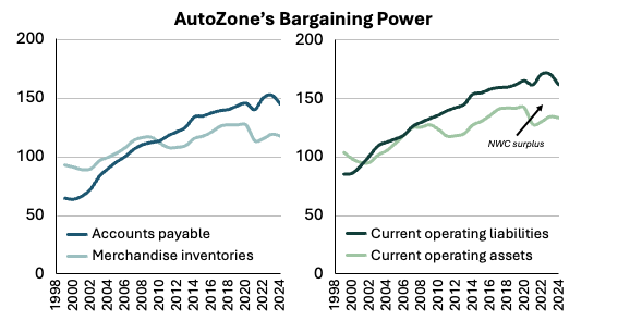 Inventory and accounts payable make up nearly all of AutoZone’s net working capital—the capital tied up in day-to-day operations. In fact, AutoZone has optimized its accounts payables to a point where its current operating liabilities now exceed its current operating assets. The result? AutoZone is provided short-term capital, totaling $1.5 billion in 2024, that it does not have an ownership claim over, but can deploy for value-creating investments, just like an insurance company uses its float.