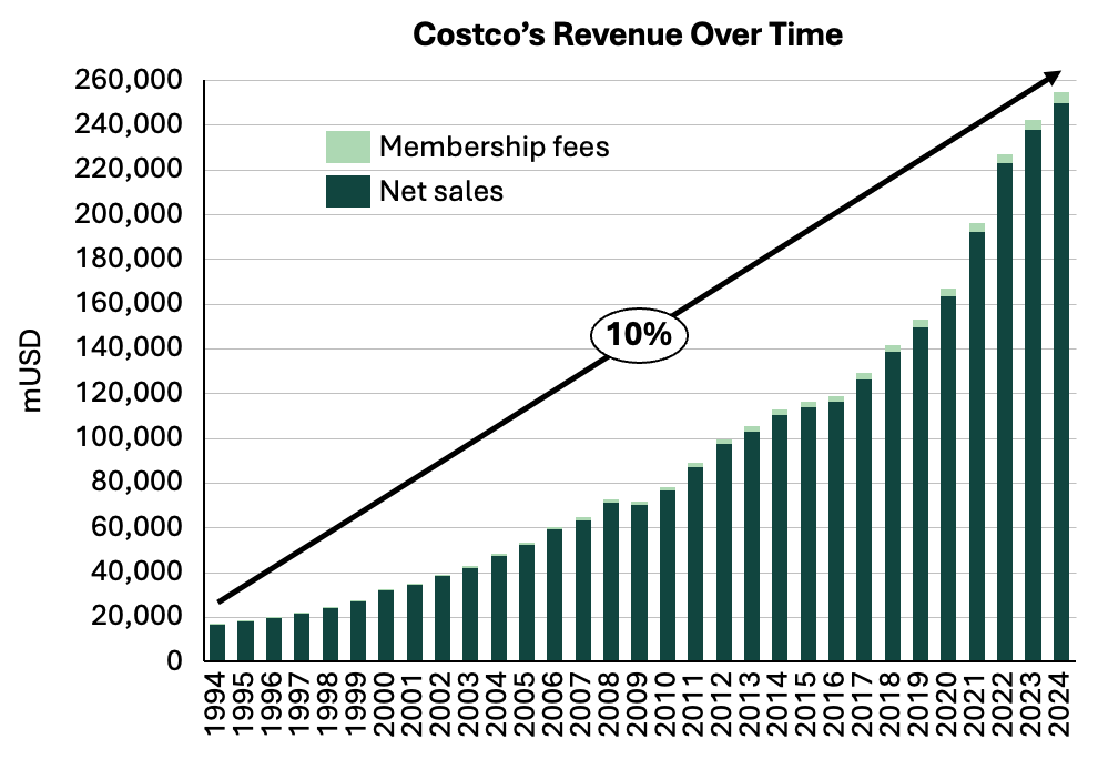 In the past 30 years, Costco has compounded its revenues with almost 10% per year—where about two-thirds have come from an increase in same-store sales. Since its founding, sales have decreased only once—in 2009, with a decline of 1.5%, compared to the 2008-level.