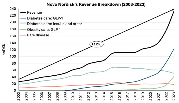 The company has achieved significant revenue growth over the past 20 years, compounding at an annual rate of almost 12%—accelerating to 22% in the past three years, driven exclusively by its GLP-1 product portfolio.